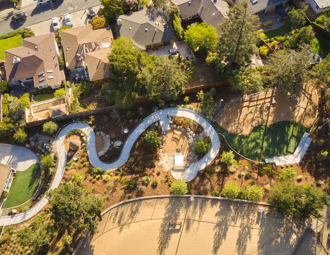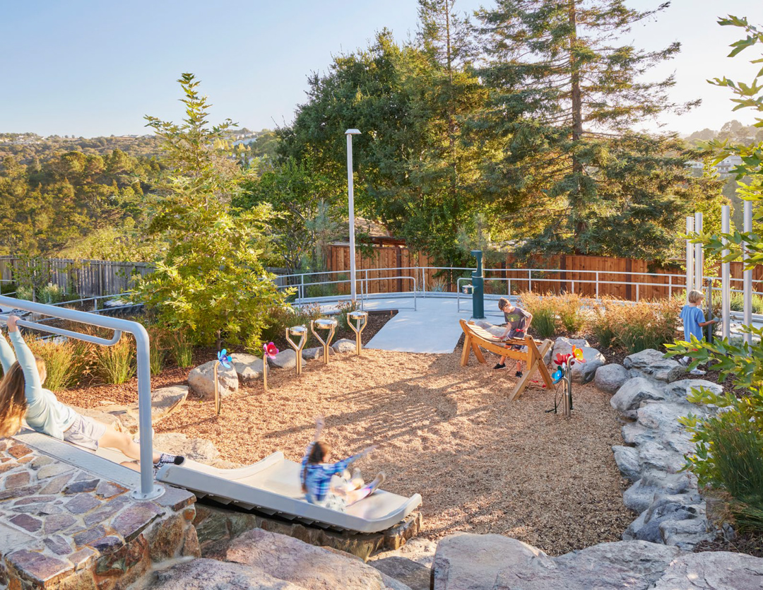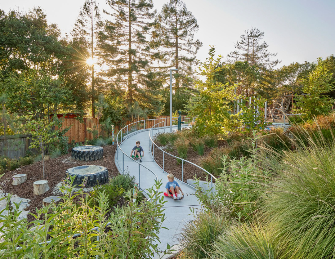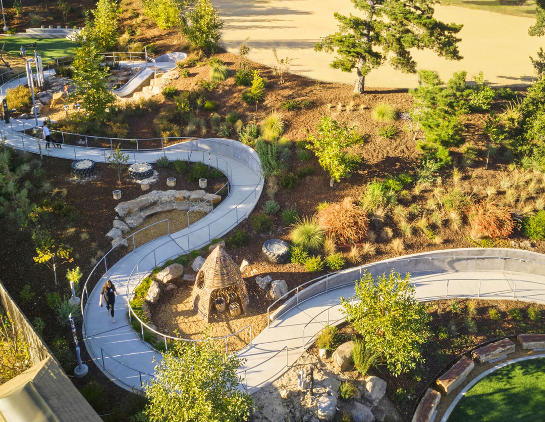 To achieve this goal on a steeply sloping site, an organically shaped central circulation path that followed the site contours become a critical design element that tied the project together, and enabled a variety of play experiences that were accessible to all.